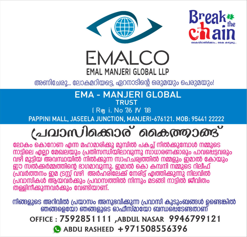 കോവിഡ് കാലത്ത് ഇമാൽക്കോയുടെ ഷെയർഹോൾഡർമാരുടെ സഹകരണത്തോടെ കോവിഡ് കാരണത്താൽ പ്രയാസമനുഭവിക്കുന്ന പ്രവാസികൾക്കും x പ്രവാസികൾക്കും ഇമാൽക്കോയുടെ ഭക്ഷ്യക്കിറ്റ് ഇമ മഞ്ചേരി ഗ്ലോബൽ ട്രസ്റ്റ്‌ വഴി വിതരണം ചെയ്യുന്നതിന്റെ ഉൽഘാടനം ഇമ മഞ്ചേരി ഗ്ലോബൽ ട്രസ്റ്റ്‌ ചെയർമാൻ ഹുസൈൻ നാലകത്ത് നിർവഹിക്കുന്നു , ചടങ്ങിൽ ഇമാൽക്കോ ജനറൽ മാനേജർ നാസർ കൂളിയൊട്ട് , ട്രസ്റ്റ്‌ വൈസ് ചെയർമാൻ ഷാജി കിഴക്കാത്ര എന്നിവർ സംസാരിച്ചു .